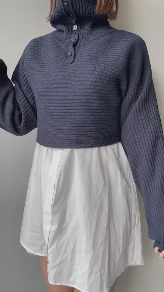 ニットをレイヤードしたあざとワンピース。ネック部分にボタンを施しているので、デザイン性のある一枚になっております。また、ボタンを外すとオープンカラーとしても使えるためハイネックが苦手な方でも挑戦しやすい◎