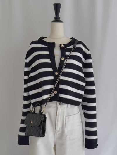 クラシカルなボーダー柄とブラックに上品なゴールドボタンをあしらったニットカーディガン。